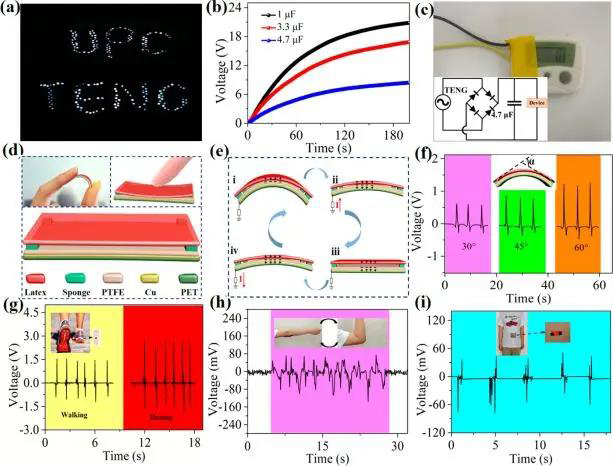 柔性TENG在人体各个部位的运动检测应用:(g)脚、(h)肘和(i)胃。