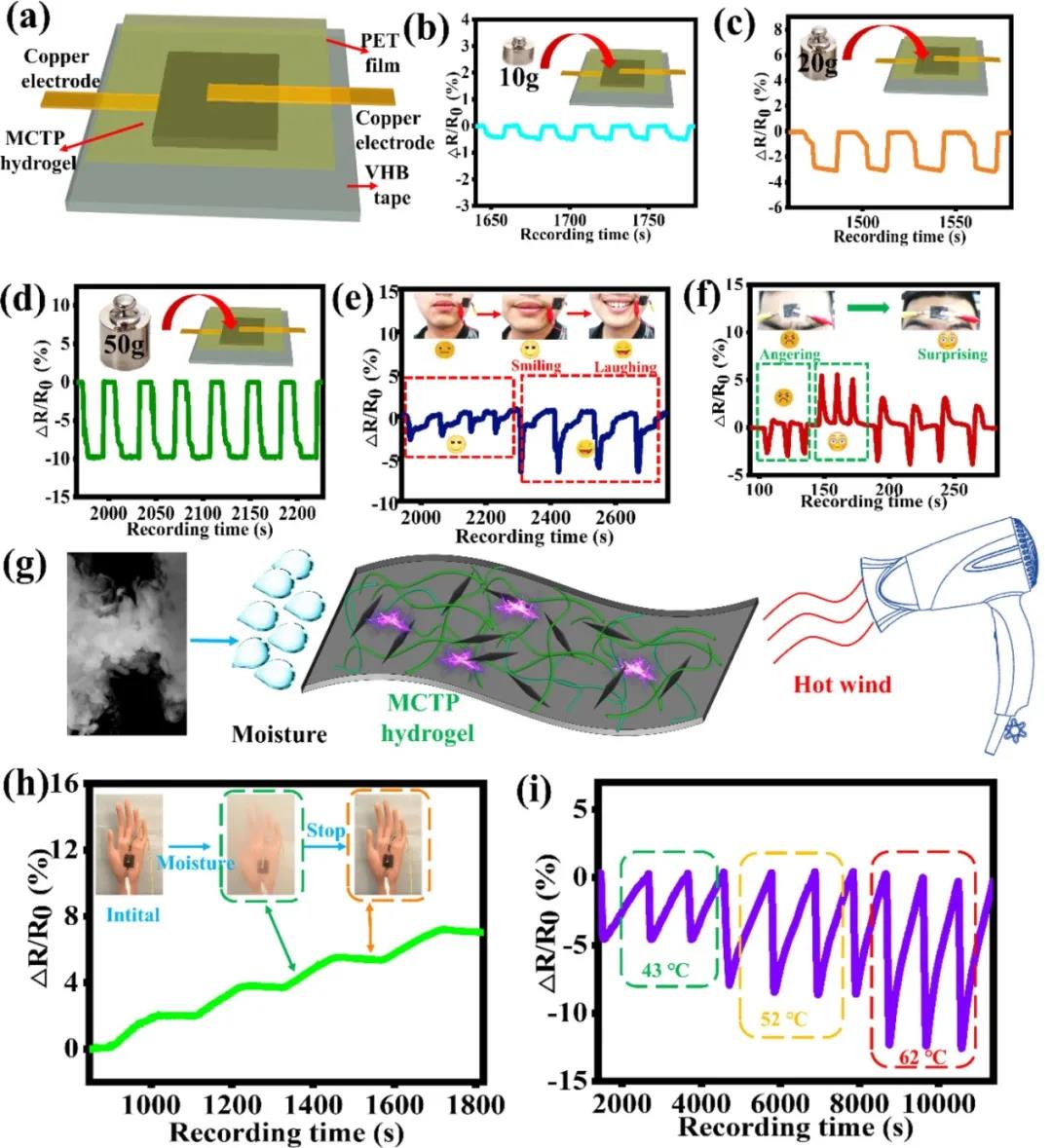 图3.MCTP水凝胶基传感器的多种传感特性。