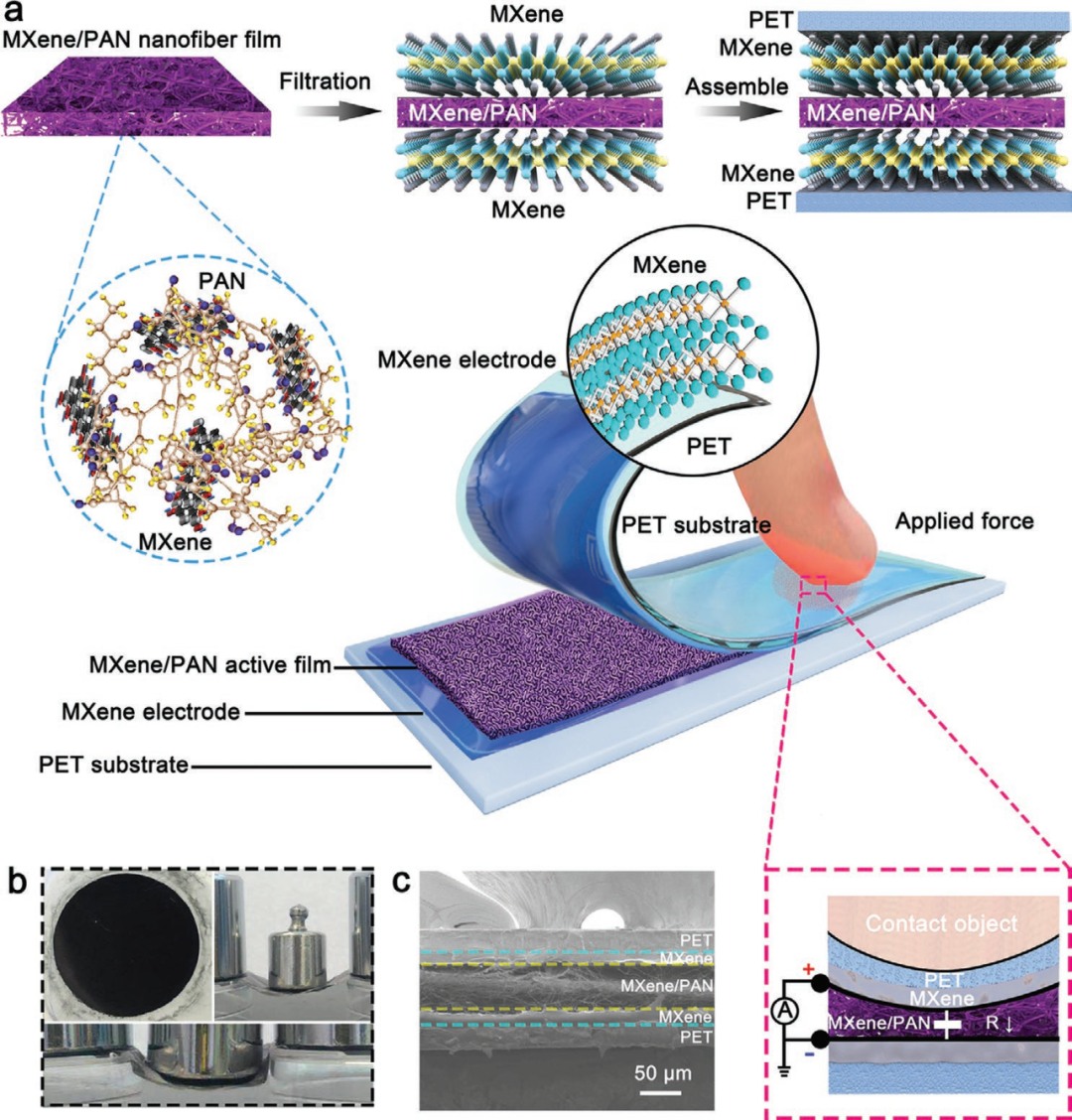 a)带MXene电极和基于MXene/PAN的柔性压力传感器的工作机制和制造过程。