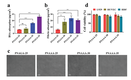 图4 自融合PNAAA水凝胶的防污能力和细胞活力。a)BSA在自融合PNAAA水凝胶和PNAGA-25水凝胶上的吸附。b)纤维蛋白在自融合PNAAA水凝胶和PNAGA-25水凝胶上的吸附。c)18小时后,L929细胞在自融合PNAAA水凝胶和PNAGA-25水凝胶上的细胞附着。放大倍率:200×;比例尺:100 μm。d)自融合的PNAAA水凝胶的细胞毒性。