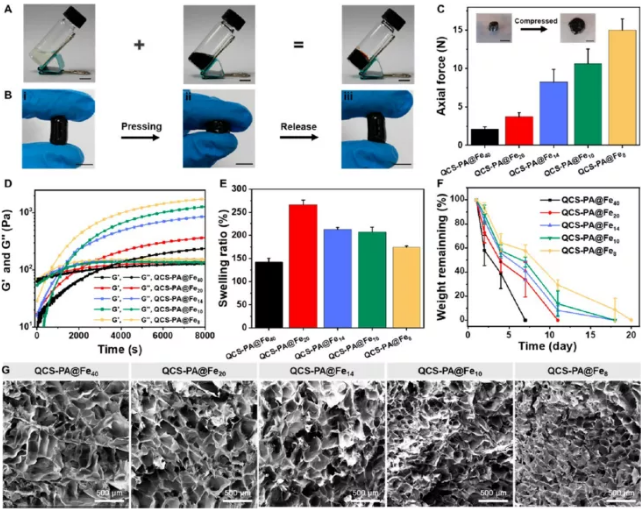 图1 粘性水凝胶的制备和应用示意图水凝胶材料性能表征凝胶时间对于水凝胶作为生物材料的应用很重要。凝胶的储能模量(G′)和损耗模量(G″)随时间的变化在流变仪上进行检测(图2D),凝胶时间确定为G′和G″. 55的交点。随着磷酸铁含量的增加,凝胶时间从50分钟减少到10分钟,G′值从270帕增加到1980帕,表明双动态键交联相互作用可以提高凝胶的力学性能。此外,人们普遍认为水凝胶作为敷料可以吸收组织渗出物,保持湿润的环境,有利于伤口恢复。因此,水凝胶的溶胀率在37℃下在PBS (pH 7.4)中进行检测。在图2E中,湿水凝胶的溶胀率从267%下降到174%,在PBS中浸泡12小时后,氨基和醛基的摩尔比从20∶1变化到8∶1,这归因于凝胶的交联密度增加。交联密度最低的QCS-帕@Fe40显示出比其他水凝胶样品更低的超顺磁性,这可能是由于QCS-PA@Fe40的松散网络结构更容易被侵蚀,通过扫描电镜观察了水凝胶的形貌。这表明制备的水凝胶具有多孔结构(图2G)