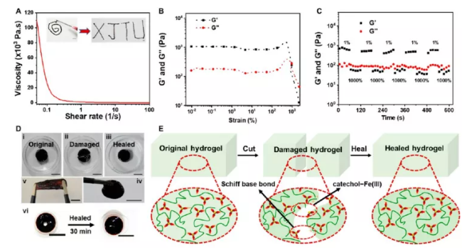 图2 水凝胶材料表征自愈合和可注射性由于剪切变稀能力,具有优异的自主愈合性能和形状适应性特征的水凝胶在伤口闭合中显示出有希望的应用。水凝胶的粘度(QCS-PA@Fe10)随着剪切速率的增加而降低(图3A),证明了凝胶的剪切变稀能力。同时,水凝胶可以通过注射器连续注射,以绘制“XJTU”的字母,并在剪切力去除时保持稳定的凝胶状态。