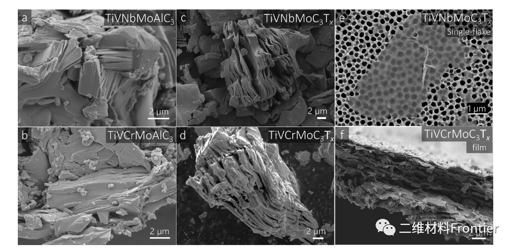 图3.高熵MAX相和Mxene相的SEM显微图。