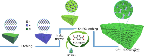 MXene上原位修饰的无定形MOFs衍生的磷酸镍的制备过程。首先通过利用HF水溶液蚀刻Ti3AlC2粉末获得MXene纳米片。所制备的MXene纳米片提供了丰富的层间官能团和宽表面以加速无定形MOF的原位生长,并获得了MXene-MOF。随后,利用KH2PO4作为磷源,对MXene-MOF进行水热处理以实现MOF的原位磷酸化,MOF球体被蚀刻成分级多孔的磷酸镍纳米球,从而得到MXene-NPO。