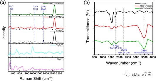 图1所示:(a)MXCs、PANBA和MXC/PANBA粘合剂薄膜的拉曼光谱图。(b)PANBA和MXC/PANA粘合剂薄膜的FT-IR光谱。
