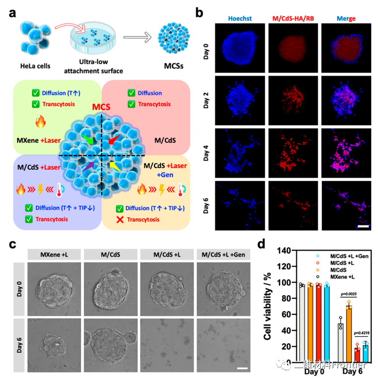 图6.(a)通过温升(T↑)增强扩散、TIP降低的MCSs配方和穿透机制、MXene+L、M/CdS、M/CdS+L和M/CdS+L+Gen;(b)在第0至第6天激光照射用M/CdS/HA/RB处理的MCSs的荧光图像(比例条=100μm)。(c)在第0天和第6天使用MXene+L、M/CDS、M/CDSAD+L和M/CDS+L+Gen处理的MCS图像(刻度条=100μm)。(d)在第0天和第6天使用MXene+L、M/CdS、M/硫化镉+L和M/CdS+L+Gen治疗的MCSs的细胞生存能力。