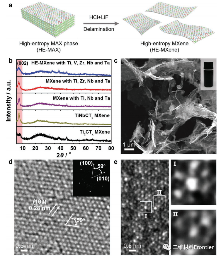 a)用HE-MAX(Hi1/5V1/5Zr1/51/5Nb1/5Ta1/5)2AlC制备HE-MXene的示意图。b)具有Ti、V、Zr、Nb、Ta种的MXenes的XRD模式,表现出特征性的(002)峰。c)SEM,d)HRTEM和插入相应的HE-MXene原子层的FFT图像,显示超薄和单晶特征。c)中的插图显示了在浓度为1mgmL−1时分散在水中的HE-mxene原子层的照片。e)原子分辨率HAADF图像和HE-MXene区域I和II的放大视图,显示了一些不同亮度强度的原子排列为扭曲的六角形结构。