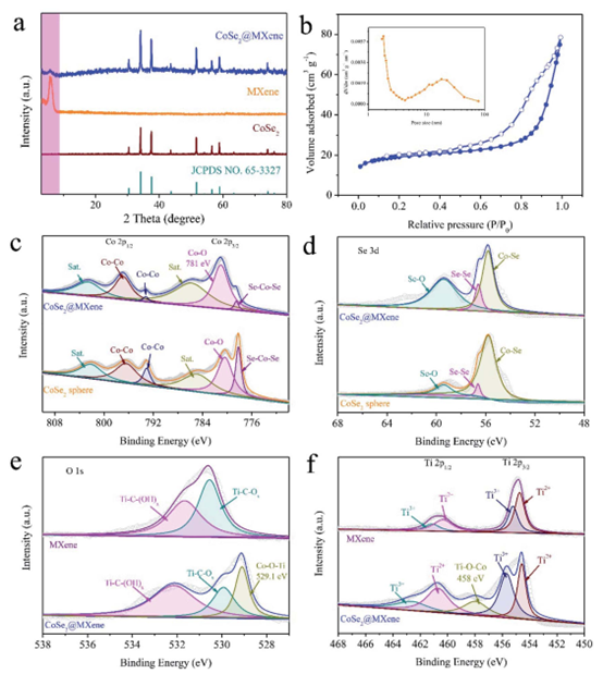 图3. CoSe2空心球,Ti3C2 MXene与CoSe2@MXene复合物的XRD图谱;CoSe2@MXene的比表面积与孔径分布;CoSe2@MXene各元素的XPS。