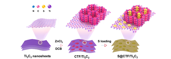 图一.二维CTF/TNS异质结构和S@CTF/TNS复合材料的合成过程示意图.