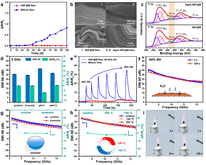 图4. ANF@MXene纤维的(a-c)抗氧化性能;(d)耐强酸、强碱;(e,f) 耐湿气;(g) 耐海水;(h)耐高低温和(i)不燃性。
