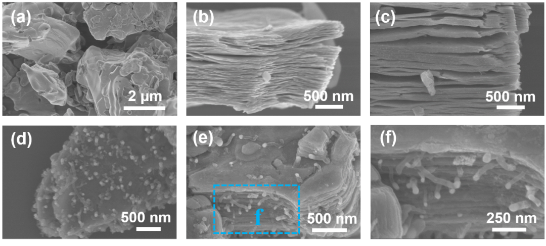 图3. (a) MAX、(b) MXene、(c) MXene-alk、(d-f) MXene-CNTs/Ni的SEM图。