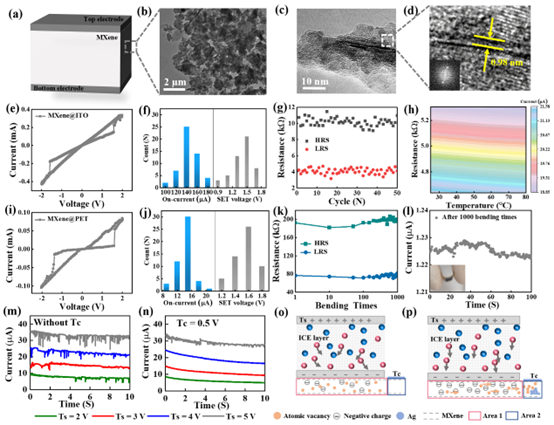 图2. 两种MXene人工突触以及ANS器件的基本电学特性。(a) MXene人工突触的结构示意图。(b)-(d) MXene纳米片的HRTEM图像。MXene@ITO的(e) I-V特性,(f) 开启电压以及电流统计,(g) 高低电阻统计分布,(h) 温度依赖性测试。MXene@PET人工突触的(i) I-V特性,(j) 开启电压以及电流统计,(k) 弯曲耐久性测试,(l) 弯曲后的保持特性。(m) 人工突触悬空后,ICE层的电流稳定性测试。(n) 人工突触以0.5 V偏置后,ICE层的电流稳定性测试。(o) 人工突触悬空后,ICE以及MXene层的离子迁移示意图。(p) 人工突触以0.5 V偏置后,ICE以及MXene层的离子迁移示意图。