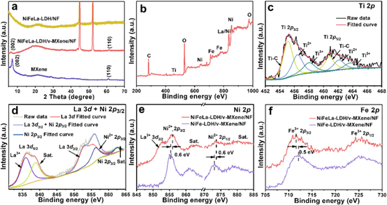 图2. NiFeLa-LDH/v-MXene/NF的XRD与XPS光谱。