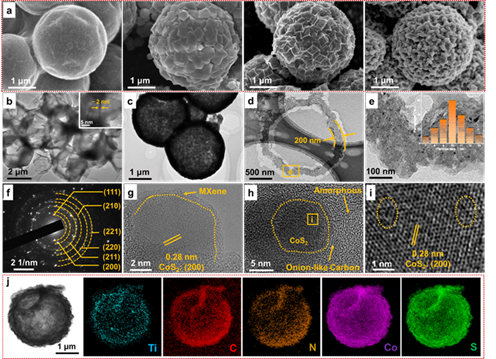 图2. (a) 从左到右依次是PMMA@MXene, PMMA@MXene@ZIF-67, MXene@Co3O4/NC和MXene@CoS2/NC的SEM图。(b)MXene中空球的TEM图,插入的放大部分显示了其厚度。(c-e) MXene@CoS2/NC的TEM和截面TEM图,(e)的插图是CoS2纳米颗粒的尺寸分布图,(f) MXene@CoS2/NC的SAED图,(g-i) MXene@CoS2/NC的HRTEM图,(j)STEM图像和MXene@CoS2/NC的相应元素分布图。