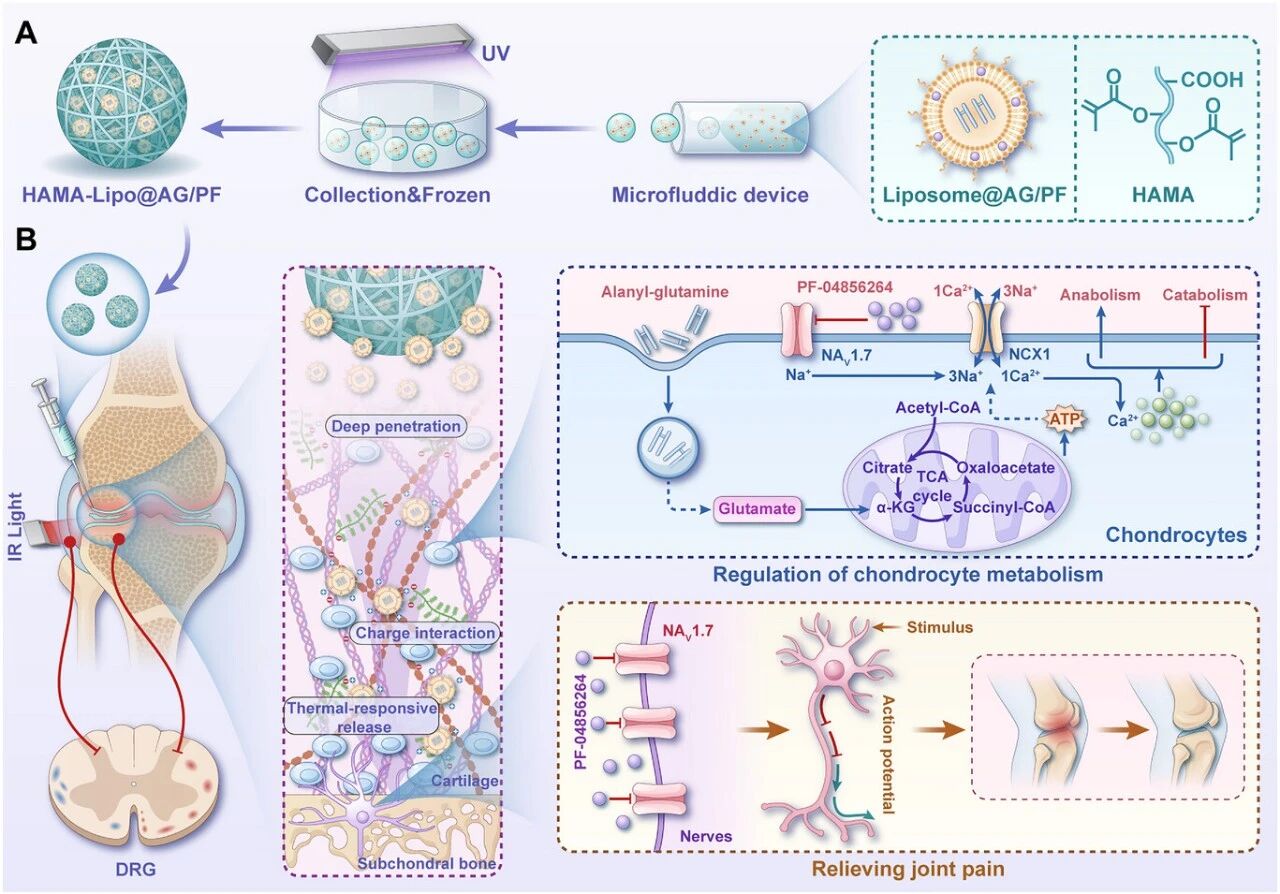 骨关节炎(OA)是一种退行性关节疾病,表现为慢性疼痛和软骨退化,缺乏有效的分子途径靶向疗法。电压门控钠通道 Nav1.7 因其在疼痛传递和软骨细胞代谢调控中的双重作用,被认为是一个有前景的治疗靶点。然而,炎症引起的线粒体功能障碍显著降低 Nav1.7 抑制剂 PF-04856264(PF)的疗效,而 Nav1.7 抑制剂在镇痛和软骨保护作用上表现出剂量依赖性的变化。为解决这一限制,开发了一种关节内缓释平台,将甲基丙烯酸透明质酸微球与阳离子脂质体整合,形成双释放平台。该平台增强关节内药物滞留,并通过克服静电屏蔽改善软骨穿透性。体外研究表明,异戊酰谷氨酰胺(AG)能有效缓解线粒体氧化应激,恢复能量代谢稳态,并通过 ATP 的产生增强 PF 介导的钙流入和软骨代谢调控。在碘醋酸钠诱导的骨关节炎模型中,PF 和 AG 联合施用显著减轻了软骨退化并改善了关节功能。此外,PF 的响应式释放特性支持按需镇痛。该靶向策略结合了疼痛缓解与通过个性化药物递送保护软骨,通过同时调节神经元和软骨细胞功能,为骨关节炎提供了一种新颖的治疗方法。