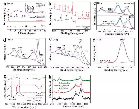 图1 (a)不同样品的XRD图谱,Ti3AlC2前驱体(黑色), 碱诱导的褶皱Ti3C2骨架(红色),Ti3C2 / NiCo-LDH(蓝色)和Ti3C2/ NiCoP(紫色); (b) 磷化前后的Ti 2p的XPS图谱和 (c)高分辨率XPS图谱(d-f) Ti3C2 / NiCoP杂化体的Ni 2p,Co 2p和P 2p的高分辨率XPS图谱 (g) Ti3C2纳米片(黑色),碱诱导的3D Ti3C2网络(红色)和Ti3C2/ NiCoP杂化物(绿色)的拉曼光谱