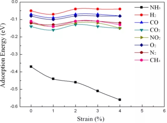 图5 气体分子(包括NH3、H2、CH4、CO、CO2、N2、NO2或O2)在单层Ti2CO2上的吸附能作为施加的双轴应变的函数(从0到4%)。