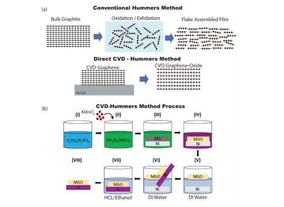 为突破这一瓶颈,一项全新的制备策略被提出。该方法的核心在于“直接转化”而非“先破坏后组装”。研究人员利用化学气相沉积技术在镍箔上生长出高质量、大面积且结构连续的多层石墨烯薄膜。关键的一步是,他们将附着在镍箔上的整片多层石墨烯直接浸入温和的酸性氧化溶液中。在这里,镍箔不仅作为生长基底,更在氧化过程中扮演了至关重要的“机械支撑”角色。它像一副坚固的骨架,牢牢固定住石墨烯的碳层平面,使其在氧化剂插入层间、引入含氧官能团的同时,避免了碳层平面因过度氧化和应力而发生的撕裂与剥离。最终,整片连续的多层石墨烯被完整地转化为一片同样保持连续层状结构的多层氧化石墨烯薄膜,实现了从“CVD-MG”到“CVD-MGO”的原位转化。