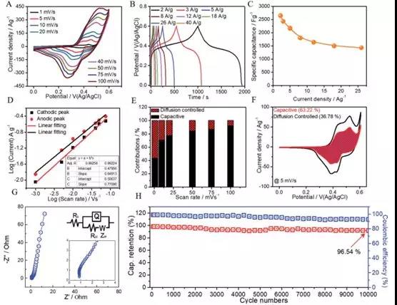 图3. ZCO@CFT电极在电解液中的电化学性能及动力学分析:(A)CV (B) GCD (C)比电容和电流密度的函数 (D)测定正极和负极峰值电流的线性拟合结果计算b值,分别为0.85和0.770(内图(D))(E)的法拉第扩散的贡献率和电容电荷存储 (F)扫描速率为5mVs-1时电容和法拉第扩散控制的电荷存储过程的典型分离 (G)EIS阻抗谱的尼奎斯曲线, 和(H) 在电流密度为25 A g-1时的循环稳定性。