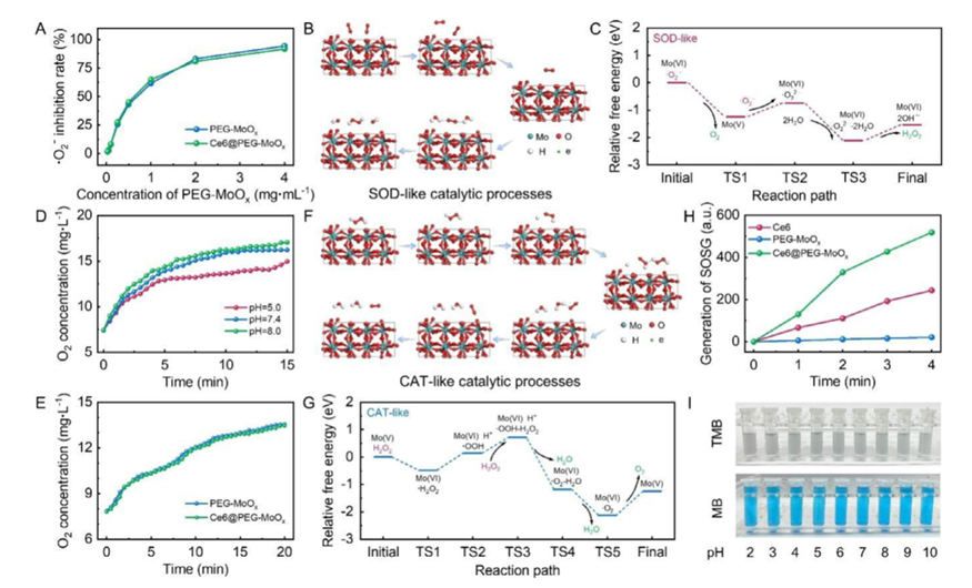 EG-MoOx 的催化特异性 (A) ⋅O2− 抑制率,在 Ce6 负载前后通过 WST-8 测定。 (B) MoOx 类 SOD 催化过程的分子模型。 (C) SOD 类催化过程的 DFT 计算相对自由能。 (D) 不同 pH 条件下 PEG-MoOx 的 O2 生成能力。 (E) Ce6 负载前后 PEG-MoOx 的 O2 生成能力。 (F) MoOx 类 CAT 催化过程的分子模型。 (G) CAT 类催化过程的 DFT 计算相对自由能。 (H) 在 0.5 mM H2O2 水溶液中,通过 660 nm 激光照射,使用单态氧传感器绿色 (SOSG) 探针检测 1O2 生成。 (I) 3,3,5,5-四甲基联苯胺 (TMB) 和亚甲蓝 (MB) 探针用于检测 PEG-MoOx 在不同 pH 值下的活性氧 (ROS) 生成能力。