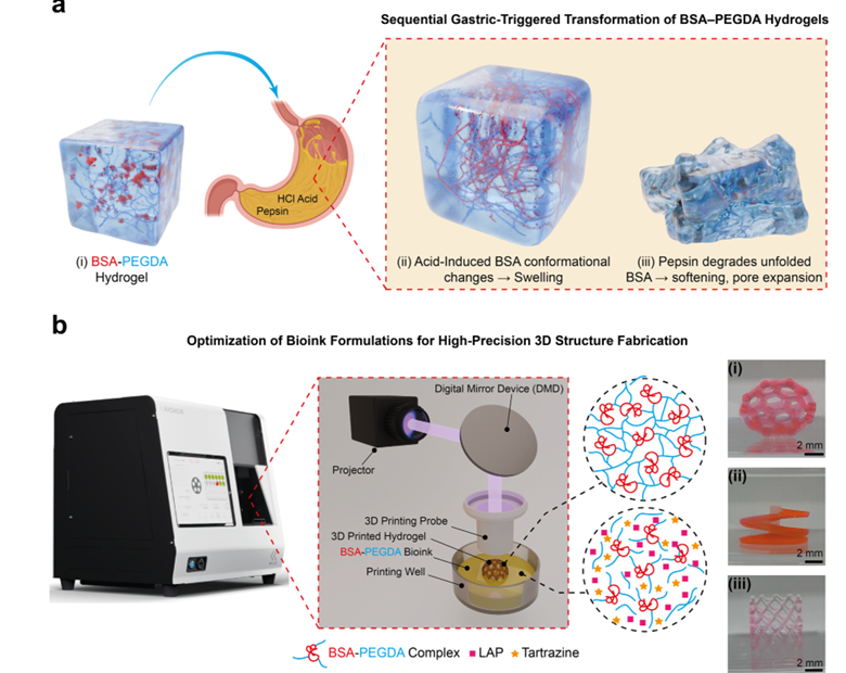 BSA-PEGDA水凝胶的酸和酶触发转变及优化BSA-PEGDA生物墨水的高保真3D打印。(a) BSA-PEGDA水凝胶在胃液中响应机制的示意图。(i) BSA分子共价嵌入PEGDA网络中,形成单一的混合结构。在中性环境下,BSA(红色)在水凝胶内保持其球状构象。(ii–iii) 在胃液条件下,水凝胶经历两个连续的形态转变。在早期阶段,酸性pH引起BSA部分展开(以红色线条链表示),而胃蛋白酶介导的降解仍然很少,导致初始膨胀。随着时间的推移,胃蛋白酶的降解作用逐渐占主导地位,导致越来越多的BSA被降解,水凝胶逐渐软化,孔隙扩大,可通过红色BSA组分消失和网络部分坍塌来观察到。(b) BSA-PEGDA水凝胶的合成与3D打印。BSA-PEGDA复合物通过Aza–Michael加成反应合成,其中BSA赖氨酸残基的一级胺基与PEGDA的丙烯酸酯基反应形成稳定的共价键。将该BSA-PEGDA结合物混合LAP和向日葵黄素(Tartrazine)制备成可光固化生物墨水。然后将墨水装入配备405 nm紫光源(半高宽±7.5 nm)的BIONOVA X(CELLINK)DLP 3D生物打印机中。打印时光强约为12 mW cm−2(对应打印机可调范围4–16 mW cm−2的75%),层厚为50 µm,XY分辨率为10 µm,Z精度为4 µm(电机驱动),每层曝光时间为10秒。在这些条件下,405 nm照射能高效激活LAP,启动PEGDA乙烯基的自由基介导聚合,实现具有高保真的水凝胶逐层构建。打印后,将样品在TRIS溶液中彻底冲洗(10分钟×3轮),以去除未反应的单体和残余光引发剂。(i–iii) 展示了使用优化BSA-PEGDA生物墨水配方(BSA-PEGDA:LAP:向日葵黄素=24:6:1,v/v/v)通过3D打印制备的清晰定义的空心C60、支架和螺旋结构。这些结构显示出精确的形态定义和高结构保真性,突显了向日葵黄素在提高复杂几何体分辨率中的关键作用。