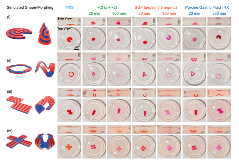 胃信号驱动的复杂三维打印双层水凝胶执行器形状变换。评估了四种不同的三维打印水凝胶执行器形状(i-金字塔,ii-环,iii-竹子,iv-盒子)在37°C下6小时内在不同环境中的自主形状变化,包括HCl(pH约2)、SGF(胃蛋白酶 0.5 mg/mL,pH约2)和PFG(4倍浓度,pH约2)。在TRIS中,水凝胶保持其原始形状。在HCl(pH约2)中,水凝胶从平面形状转变为稳定的三维结构。在SGF或PGF中,水凝胶执行器最初从平面结构弯曲为三维结构,然后逐渐恢复到其原始形状。