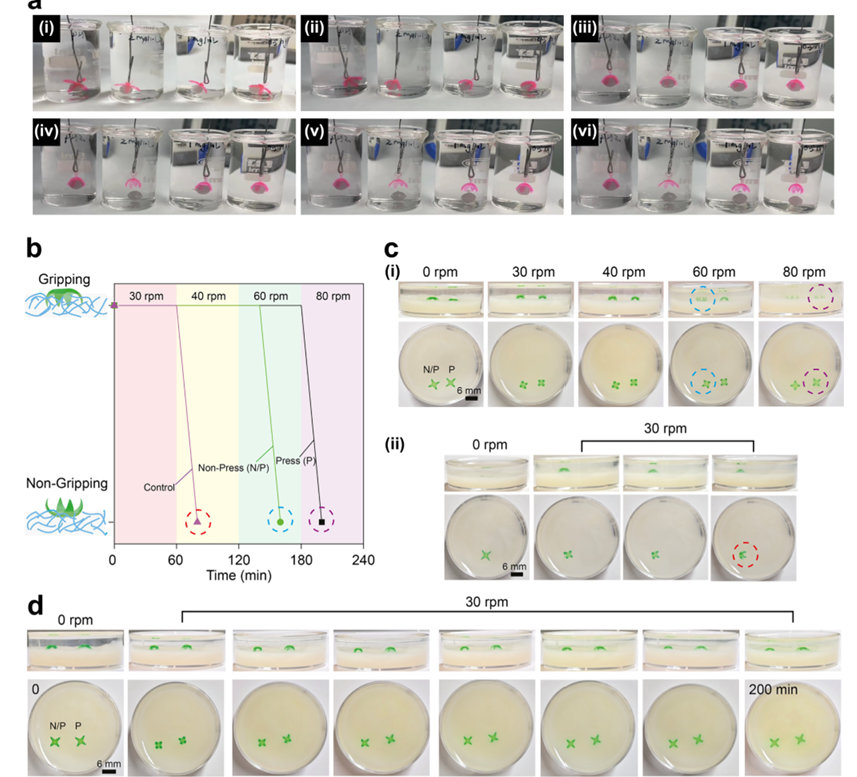 3D打印水凝胶夹钳在模拟胃和黏液环境中的自主捕捉释放行为。(a) 在37°C条件下,3D打印水凝胶夹持器在盐酸(pH ∼2)和SGF(胃蛋白酶2、1和0.5 mg/mL,pH ∼2)(i-vi)中实时形态变形。随着时间推移,在SGF中,水凝胶逐渐弯曲并夹住塑料球,然后松开并恢复原形。更高的胃蛋白酶浓度加快了水凝胶的降解,导致球体提前释放,而浓度越低,释放速度越慢。相比之下,在盐酸(pH ∼2)中,水凝胶持续抓握球体而不松开。(b,c)左(N/P)和右(P)夹具在酸性和类似黏液的环境中的抓握性能。(i) 在盐酸(pH ∼2)中,两个抓手都能保持30和40转/分钟的抓地力;左侧(N/P)夹持器在60转/分时失去抓地力,而右侧(P)夹持器仅在80转/分钟时失去抓地力。(ii) 对照组中,夹持器(非嵌入式)在自然弯曲后转速40转/分钟时失去抓地力,表明抓握性能较弱。(d) 在SGF(胃蛋白酶1 mg/mL,pH ∼2)30转/分钟时,夹持器自动捕获并释放模拟的黏液层。