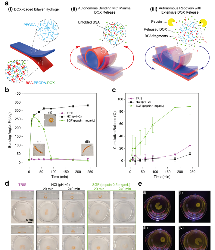 自主、酶调控的形状变形及药物释放,均来自3D打印的BSA-PEGDA-DOX双层水凝胶执行器。(a) BSA-PEGDA-DOX双层水凝胶执行器的自主形态变形及药物释放行为的示意图。(i)最初,水凝胶由PEGDA被动层和DOX加载的BSA-PEGDA活性层组成。(ii)在酸性胃液(pH ∼2)中,BSA展开,诱导自主弯曲,DOX释放极少。(iii)随着胃蛋白酶介导降解的加剧,BSA经历酶促降解,触发形态恢复和大量DOX释放。(b) 在不同环境中对BSA-PEGDA-DOX(CDOX-凝胶∼0.8 mg/mL)双层水凝胶的形态变形和DOX释放。水凝胶在盐酸(pH ∼2)下20分钟内迅速膨胀并弯曲。在SGF(胃蛋白酶1mg/mL,pH∼2)中,它们最初弯曲,60分钟后恢复原状。相比之下,TRIS中没有发生显著的形态变化。(c) SGF(胃蛋白酶1 mg/mL,pH ∼2)条件显著加速水凝胶降解和DOX释放,而TRIS和HCl(pH∼2)条件释放较慢。(d)在不同环境中,复合形状的BSA-PEGDA-DOX(CDOX-凝胶∼0.8 mg/mL)水凝胶执行器释放DOX。在TRIS中,水凝胶保持稳定(橙色)。在非酸性条件下,它从平面结构转变为三维结构,但没有释放DOX(橙色)。在SGF(胃蛋白酶0.5mg/mL,pH∼2)处理下,它从平坦过渡到三维结构,然后又恢复平坦,同时完全释放DOC(透明)。(e)锥形执行器首先经历酸诱导弯曲,随后随着胃蛋白酶逐渐降解更多BSA而松弛(胃蛋白酶0.5 mg/mL,pH ∼2)。图像在405纳米紫光照射下录制,以监测DOX荧光。减弱的荧光信号反映了BSA-PEGDA网络中酶触发的DOX释放(见视频S5)。所有测量均使用n=3个独立样本,数据以平均±标准差(SD)形式呈现