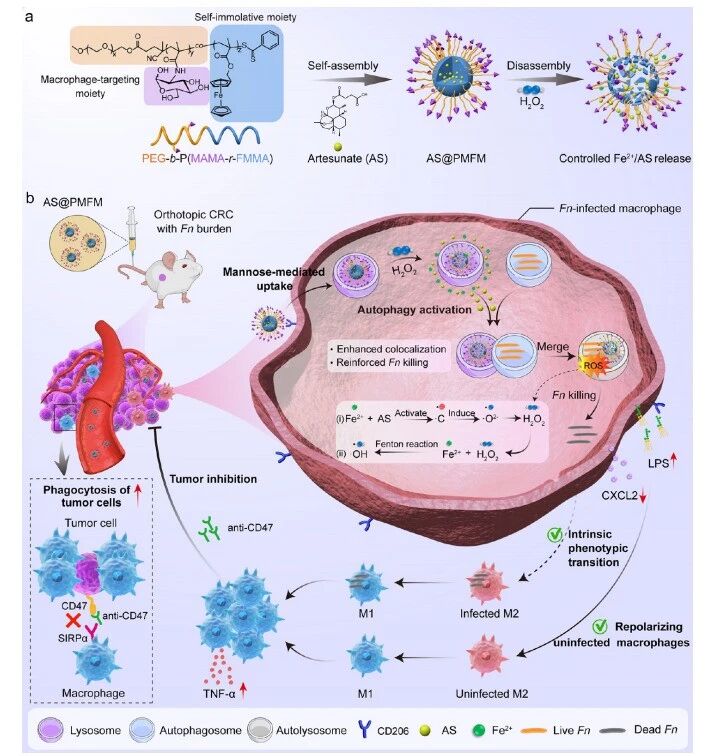 结直肠癌(CRC)的免疫治疗在临床上仍受限于极度免疫抑制的肿瘤微环境。核系杆菌(Fn)选择性定殖于 CRC 肿瘤,通过在巨噬细胞内持续存在并驱动其 M2 极化,驱动免疫抑制。我们设计了一种自激活的高分子纳米酶,该酶由含铁辛糖聚合物和青蒿酸(AS)载荷组成,用于消除巨噬细胞内 Fn 储存库并重编程巨噬细胞免疫生态系统。这些纳米酶通过甘露糖受体介导的胞吞作用被 M2 样 Fn 感染的巨噬细胞特异性吞噬,随后被细胞内过表达的过表达氢激活,释放亚铁离子和 AS,通过芬顿化学协同扩增细胞毒性活性氧(ROS)生成。同时,AS 诱导巨噬细胞自噬,促进纳米酶-细菌在自噬酶体中的共定位,以增强 ROS 介导的 Fn 杀伤。值得注意的是,细胞内 Fn 的根除不仅逆转了感染巨噬细胞的免疫抑制表型,还触发了旁分泌信号,驱动邻近未感染巨噬细胞的 M1 再极化。在含有细胞内 Fn 的异种移植和正位 CRC 模型中,纳米酶能够高效消除细胞内 Fn,并系统性重塑巨噬细胞免疫结构,显著提升抗 CD47 免疫疗法的治疗效果。本研究提出了一种通过精准靶向肿瘤相关巨噬细胞内细菌来改进 CRC 免疫治疗的策略。