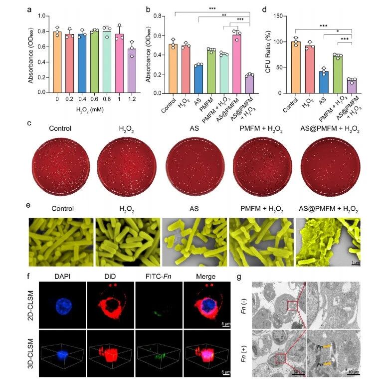 细胞外抗菌效应及Fn在巨噬细胞内驻留的测定。(a) Fn经不同浓度过氧化氢处理24小时后的OD600值。(b) 经不同处理24小时后Fn的OD600值。(c,d) 经不同处理24小时后Fn的菌落平板图像(c)及 CFU 率(d)。(e) 不同处理后Fn的代表性SEM图像。(f) RAW264.7细胞内 FITC 标记Fn的平面(2D)和z-stack(3D) CLSM 图像(MOI = 20)。(g) 未感染与Fn感染的RAW264.7细胞的TEM图像(黄色箭头指示细胞内的Fn),Fn(+)和Fn(−)分别指添加Fn或未添加Fn。数据以均值±标准差表示(n = 3)。***p < 0.001,**p < 0.01,*p < 0.05。