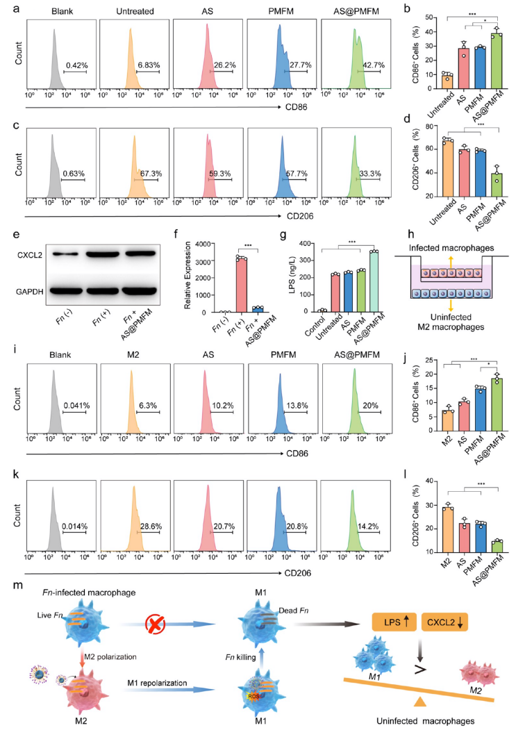 M2型巨噬细胞特异性内化过程。(a) AS@ PMFM 通过甘露糖受体介导的内吞途径进入M2型巨噬细胞。(b−d) CLSM 图像(b)及流式细胞术分析(c,d)显示M1型或M2型巨噬细胞与游离Cy5或Cy5@ PMFM 共孵育3小时后的结果。(e−g) CLSM 图像(e)及流式细胞术分析(f,g)显示未感染或Fn感染巨噬细胞与Cy5@ PMFM 共孵育3小时后的结果。(h,i)流式细胞术分析显示Fn感染巨噬细胞经不同处理3小时后的结果。数据以均值±标准差表示(n=3)。***p<0.001,**p<0.01,*p<0.05。