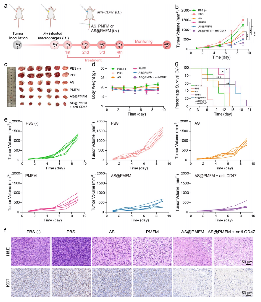 皮下结直肠肿瘤模型的体内抗肿瘤疗效。(a) 体内治疗时间线。(b) 不同治疗组小鼠的肿瘤生长曲线。PBS(−)表示未进行细胞内Fn预感染的PBS处理组。(c) 治疗结束时获取的小鼠肿瘤照片。(d) 不同治疗组荷瘤小鼠体重变化情况。(e) 各治疗组小鼠个体肿瘤生长曲线。(f) 不同治疗组肿瘤组织的H&E染色与Ki67标记图像。(g) 21天周期内各治疗组小鼠的生存率。数据以均值±标准差表示(n=6)。***p<0.001,**p<0.01,*p<0.05。