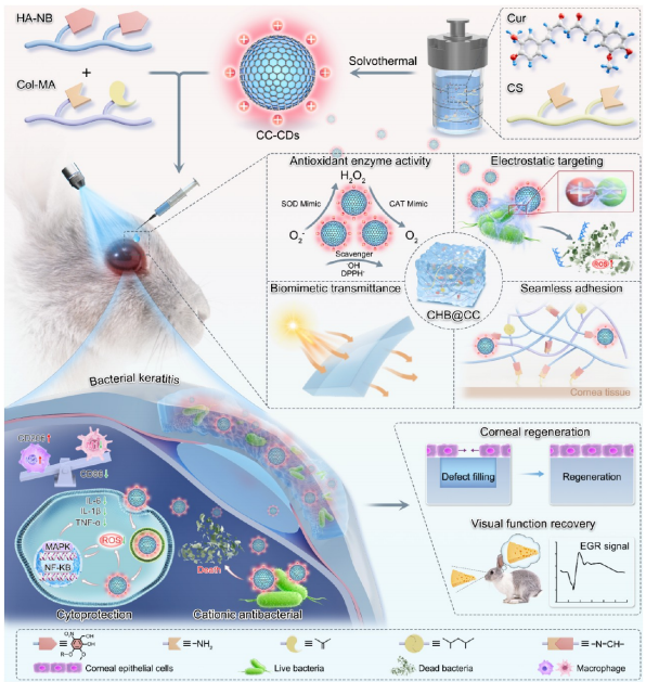 细菌性角膜炎发展到后期,常常陷入一个恶性循环:细菌疯狂繁殖,炎症反应失控,角膜组织被不断破坏,最终只能靠角膜移植来收场。现有的抗生素和激素要么抗菌效果有限,要么影响伤口愈合,很难同时把感染、炎症和组织缺损这三个问题一并解决。最近,四川大学樊渝江团队在《ACS Nano》上发表了一项研究,他们用姜黄素和壳聚糖做原料,通过水热法合成了一种多功能碳点(CC-CDs),再把这个碳点装进一种光响应胶原/透明质酸水凝胶里,做出了一款能注射、能粘附、还能透光的复合水凝胶CHB@CC。