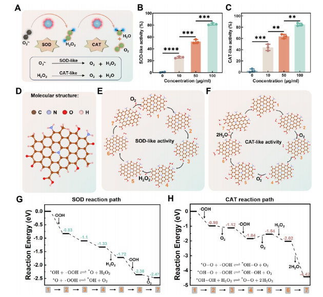 CC-CDs的SOD和CAT样催化活性。(A) 多酶样活性示意图。(B,C) 浓度依赖性(SOD样活性)(B)和(CAT样活性)(C)。数据分析采用非参数单因素方差分析及Tukey多重比较检验。数据以均值±标准差表示(n=3,**p<0.01,***p<0.001)。(D) 分子结构模型。(E) 提出的SOD样催化循环:由羟基和氨基官能团协同驱动的协同机制。(F) 提出的CAT样催化循环:由二羰基官能团介导的协同机制。(G,H) 分别为(G) SOD样反应路径和(H) CAT样反应路径的计算能量曲线(eV)