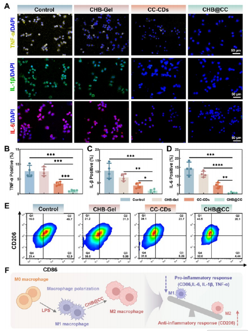 CHB @CC水凝胶抗炎与抗氧化能力的体外评估。(A) RAW 264.7细胞免疫荧光显微照片显示不同处理后 TNF - α(黄色)、IL- β(绿色)和IL-6(红色)的表达情况。细胞核经 DAPI(蓝色)复染。(B-D) (B) TNF - α 、(C) IL- βand 、(D) IL-6阳性表达的统计定量分析。采用非参数单因素方差分析结合Tukey多重比较检验进行分析。数据以均值±标准差表示(n=4,*p<0.05,**p<0.01,***p<0.001,****p<0.0001)。(E) Raw 264.7细胞与对照组、 CHB -Gel、CC-CDs及 CHB @CC水凝胶共培养后的流式细胞术分析。(F) CHB @CC调控巨噬细胞极化与炎症反应的示意图。