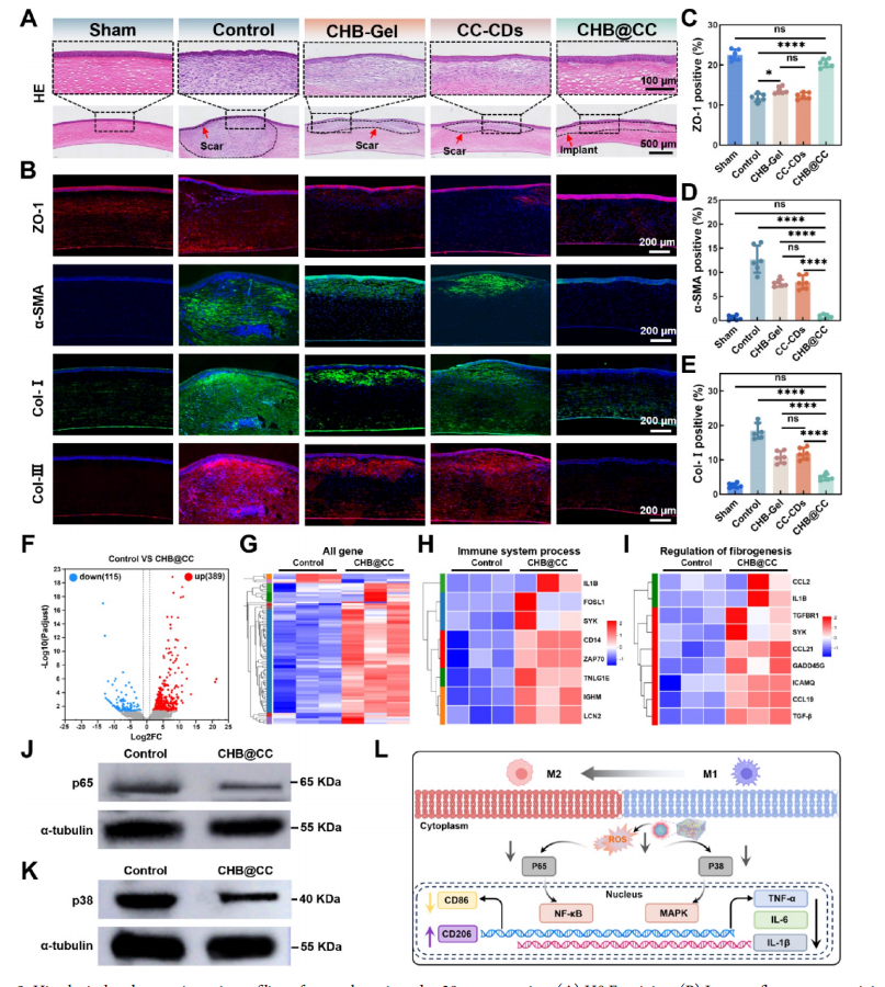 术后28天角膜修复的组织学与转录组学分析。(A)苏木精-伊红(H&E)染色。(B)ZO-1(红色)、 α -SMA(绿色)、I型胶原(绿色)、III型胶原(红色)及 DAPI(蓝色)染色的免疫荧光图像。比例尺:200 μm 。(C-E) (C)ZO-1、(D) α -SMA和(E)I型胶原的荧光强度定量分析。采用非参数单因素方差分析结合Tukey多重比较检验。数据以均值±标准差表示(n=6,p>0.05(ns)、*p<0.05及****p<0.0001)。(F)火山图及(G)对照组与 CHB @CC组差异表达基因的层次聚类热图。(H,I)GO富集分析结果:(H)免疫系统过程正向调控,(I)纤维化形成调控。(J,K)蛋白质印迹分析:(J)p65(NF -kB通路相关蛋白)与(K)p38(MAPK 通路相关蛋白), α 微管蛋白作为内参。(L) CHB @CC水凝胶调控炎症反应的分子机制示意图。