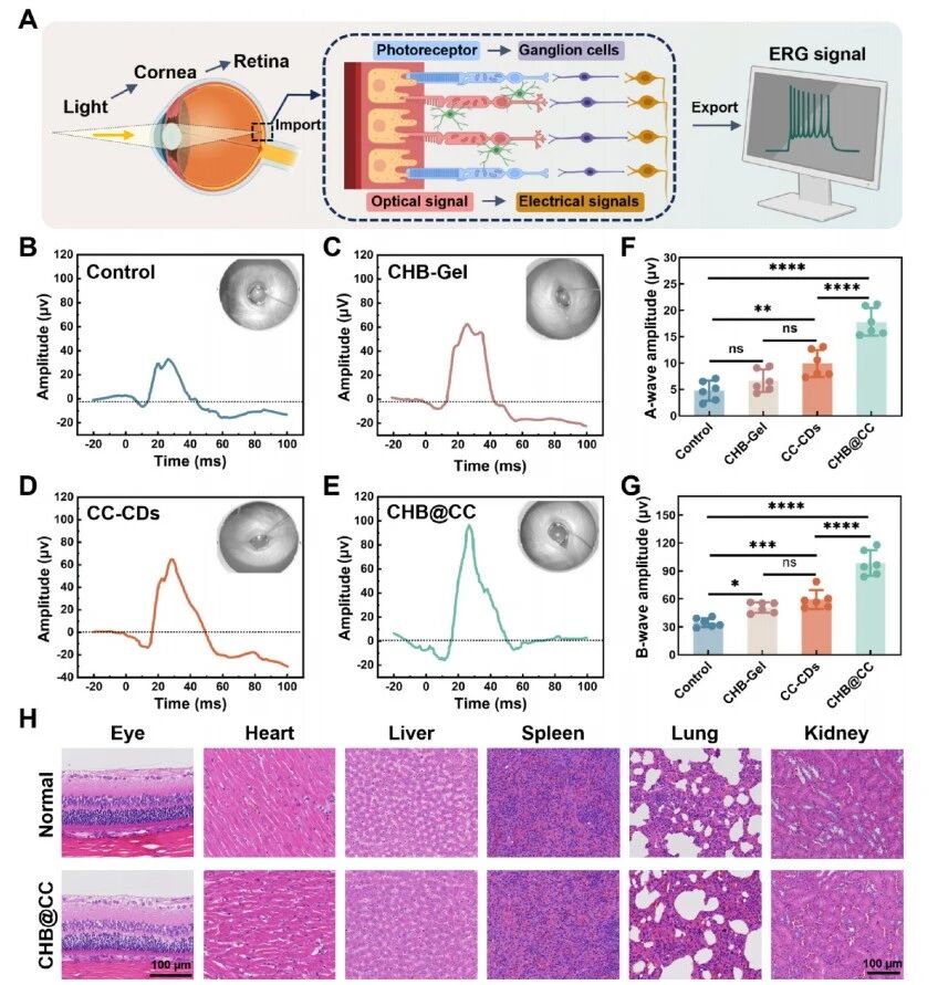 通过视网膜电图(ERG)评估视网膜功能。(A) 光刺激信号传导与ERG记录示意图。(B-E) 感染后第28天的ERG记录:(B) 对照组,(C) CHB -Gel组,(D) CC-CDs组及(E) CHB @CC组。(F,G) (F) a波与(G) b波振幅的定量分析。采用非参数单因素方差分析及Tukey多重比较检验。数据以均值±标准差表示(n=6,p>0.05(ns)、*p<0.05、**p<0.01、***p<0.001及****p<0.0001)。(H) 正常(健康兔)组与 CHB @CC组28天眼球及重要器官的代表性H&E染色图像。比例尺:100 μm 。