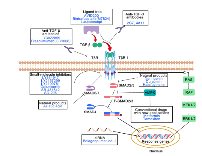TGF-β通路拮抗剂的分子作用机制。TGF-β通路拮抗剂可分为七类:抑制配体/受体相互作用的抗体、小分子抑制剂、反义寡核苷酸、配体陷阱、疫苗、天然产物及具有新应用的传统药物。TGF-β:转化生长因子-β;TβR:TGF-β受体;SMAD:抑制母体抗十五趾缺失蛋白;AMPK:腺苷酸活化蛋白激酶;RAS:大鼠肉瘤;RAF:快速加速肉瘤;MEK:丝裂原活化蛋白激酶激酶;ERK:细胞外信号调节激酶。