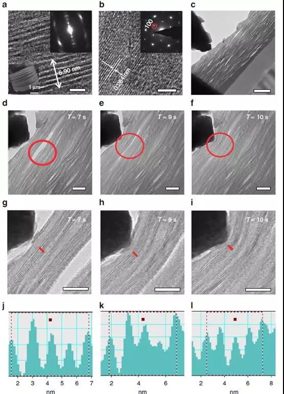 图2 MXenes的典型微观结构和在外力作用下的原位动态过程。(a) MXenes的横截面的TEM图,内部图片显示了层状结构,(b) MXenes的俯视图的HRTEM图,内部是相应的衍射图,表现出良好的六边形特征,(c)在原位力仪中,用锥形针尖支撑的纳米压头局部施加在FIB处理过的MXenes样品上。(d)-(f)在外力作用下,MXenes中较宽的距离在7、9、10 s依次从~12 nm、经~3 nm到~0 nm处迅速减小, (g)-(i)用红线标记的较窄的距离(4个间隔)依次为5.23 nm、4.98 nm和4.81 nm, (j)-(l)利用数字显微照相软件进行分析。从g的初始状态测量,h、i状态的应变值分别为4.78和8.03%。a, b是4nm, c是200nm, d-f是40nm, g-i是20nm。