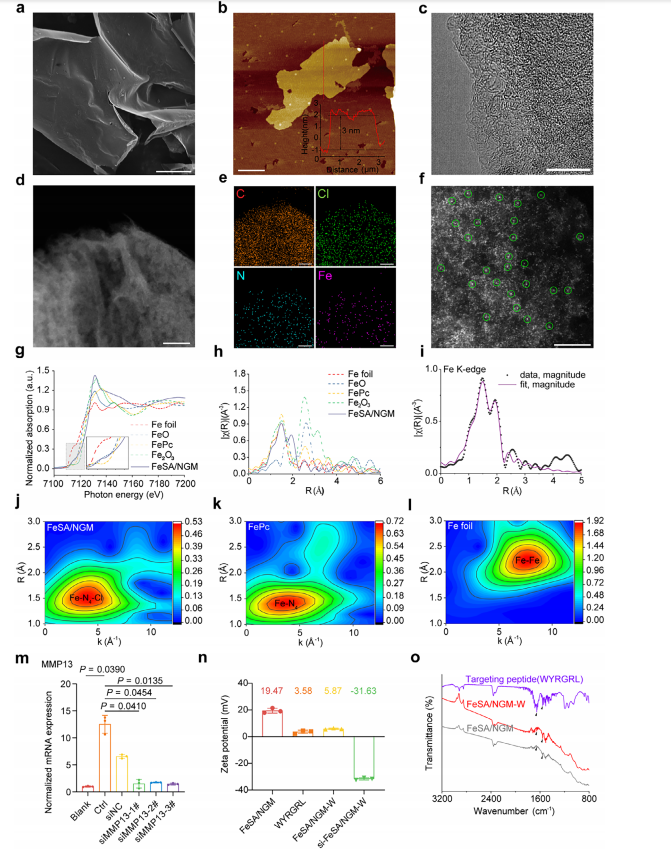 骨关节炎的进展与软骨细胞内铁死亡密切相关——活性氧堆积、谷胱甘肽耗竭、GPX4失活,最终导致线粒体崩解和基质降解。广西医科大学与中科院生物物理所团队在《Advanced Materials》发表研究,他们用混合熔盐剥离策略,将Zn-ZIF前体转化为超薄二维氮掺杂石墨烯纳米网,并在其上锚定不对称配位的Fe-N4-Cl单原子位点,再偶联软骨靶向肽WYGRGL和MMP13的siRNA,构建了一种名为si-FeSA/NGM-W的多功能纳米酶。