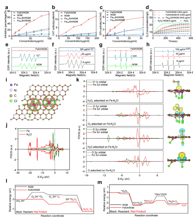 FeSA/ NGM 纳米酶的酶活性与电子结构分析。(a-c) FeSA/ NGM 和FeNASA/ NGM 纳米酶对(a)超氧化物歧化酶(SOD)、(b)过氧化氢酶(CAT)及(c)谷胱甘肽过氧化物酶(GPx)活性的浓度依赖性模拟。(d) 通过不同浓度下纳米酶变体的O2生成速率量化过氧化氢分解效率。(e-h) 电子自旋共振(ESR)谱显示FeSA/ NGM 的活性氧清除能力:(e,f) 不同浓度下超氧自由基(O2∙−)的消除,(g,h) 氢氧自由基(∙OH)的消除。(i,j) 电子结构表征:(i) 差分电荷密度分布,(j) FeSA/ NGM 的投影态密度(PDOS)。红色/绿色区域表示电子积累/耗尽。(k) FeSA/ NGM 上关键中间体(过氧化氢、O2、水、O)的吸附构型与 PDOS 分析。(l,m) 模拟SOD/CAT活性的FeSA/ NGM 上过氧化氢还原路径的自由能比较曲线与 NGM 对照组。能量值已归一化至初始反应物状态(0 eV)。数据以均值±标准差表示(n=3)。