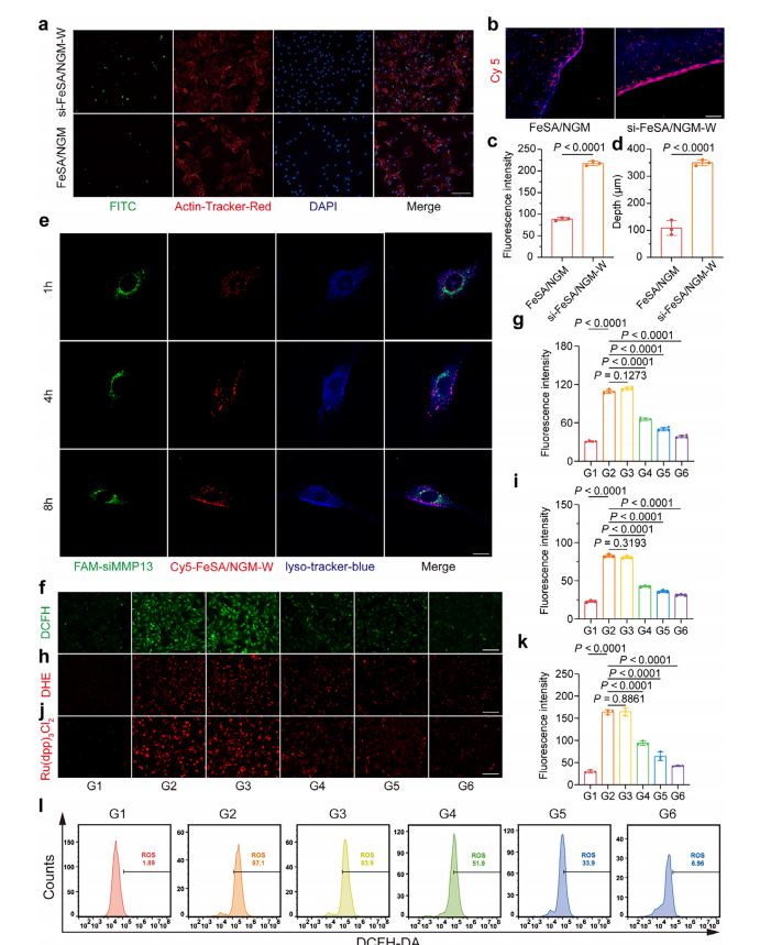 si-FeSA/ NGM -W纳米酶在软骨细胞模型中的多模态功能表征。(a,c)孵育12小时后 FITC 标记的FeSA/ NGM 与si-FeSA/ NGM -W的细胞摄取动力学。(a)代表性共聚焦显微镜图像。(c)荧光强度通过ImageJ软件进行量化。比例尺:100 µm 。(b,d)Cy5标记纳米酶在离体关节软骨中的靶向效率。(b)荧光分布;(d)荧光穿透深度量化。比例尺:1000 µm 。