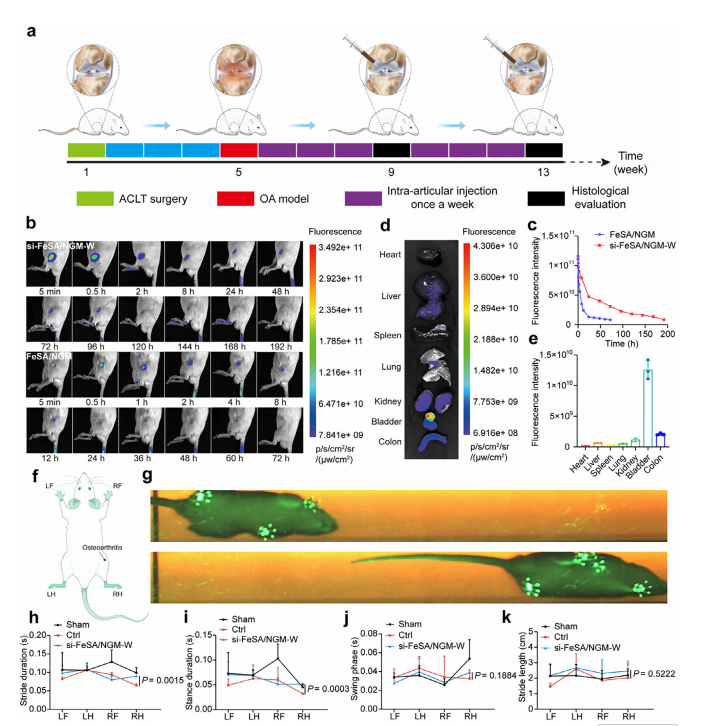 SAzyme处理的OA模型的体内生物分布、关节滞留及步态分析。(a) FeSA/ NGM 纳米酶介导的OA体内缓解示意图。(b) 膝关节内注射后,OA诱导大鼠膝关节中Cy5标记的FeSA/ NGM(上)与Cy5标记的siFeSA/ NGM -W(下)的时序荧光成像。(c) 膝关节荧光强度的定量分析。(d) FeSA/ NGM -W膝关节内注射24小时后主要器官(心脏、肝脏、脾脏、肺和肾脏)的离体荧光成像。(e) 器官荧光信号定量分析。(f,g) 步态分析示意图。为记录步态,将OA大鼠置于压力感应轨道中,记录左前爪(LF)、左后爪(LH)、右前爪(RF)和右后爪(RH)的运动。(h–k) 各治疗组步态参数比较:步长(h)、支撑期(i)、摆动期(j)和步长(k)。数据以均值±标准差表示(n=3)。P值通过单因素方差分析评估,并用星号标注。