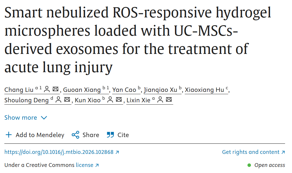 本文研究了一种新型智能雾化递送系统,针对急性肺损伤(ALI)和急性呼吸窘迫综合征(ARDS)的病理机制,开发了ROS响应性水凝胶微球,装载人类脐带间充质干细胞来源的外泌体。该系统旨在通过雾化方式直接送达肺部,以缓解氧化应激和炎症反应,从而改善肺功能和组织修复。相关文献标题发表于Materials Today Bio期刊。