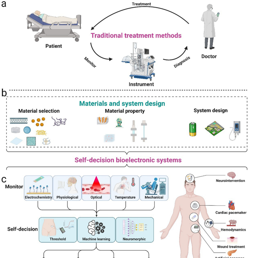 常规治疗工作流程与用于自主诊断和治疗的自我决策生物电子系统的比较。(a) 在常规治疗方法中,首先通过仪器检查获取病理数据,然后由医生进行诊断,随后开展治疗干预。(b,c) 自我决策生物电子材料和系统的概念示意图,它们能够在无需人工干预的情况下自主执行感知、数据处理和治疗操作,持续根据动态病理状态调整治疗策略。由BioRender制作。