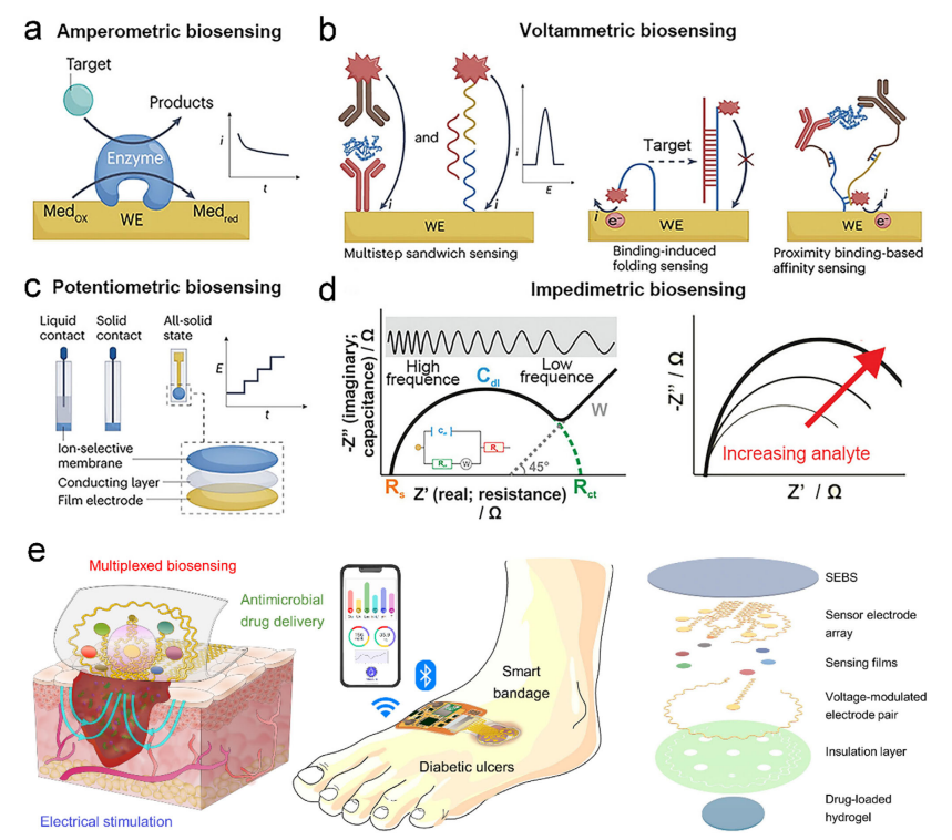 基于多种技术的电化学传感器的设计与应用。(a) 基于酶电极的代谢物靶标安培生物传感。(b) 蛋白质或核酸的伏安生物传感。(c) 不同离子的电位生物传感。(d) 不同分析物浓度的阻抗生物传感。经许可转载 [77]。版权所有 2023, Elsevier。(e) 基于高精度电化学传感器的用于慢性创伤多重监测和治疗的无线可穿戴生物电子系统。经许可转载 [80]。版权所有 2023, Wiley