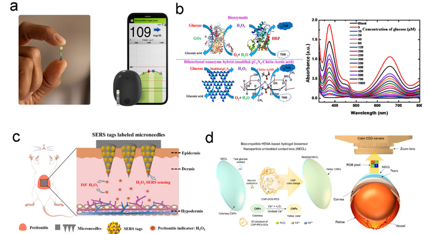 光学传感器的设计与应用。(a)用于开发商业化连续血糖监测系统的荧光化学传感器。经许可转载 [105]。版权所有 2024,美国化学学会。(b)一种经化学改性的碳化氮–壳聚糖–醋酸混合物,表现出类似葡萄糖氧化酶的活性,用于催化显色指示剂 3,3′,5,5′-四甲基联苯二胺在不同葡萄糖浓度下的紫外-可见吸收响应。经许可转载 [108]。版权所有 2020,Elsevier。(c)示意图显示通过皮肤间质液进行腹膜炎评估,其中 H2O2 作为指标由无痛表面增强拉曼散射标记微针检测。经许可转载 [109]。版权所有 2023,美国化学学会。(d)嵌入纳米颗粒的彩色接触镜及光学监测系统示意图,其中泪液葡萄糖引起纳米颗粒嵌入接触镜的黄色变化(Ce3 转 Ce4),由相机记录进行 RGB 分析。经许可转载 [110]。版权所有 2021,美国化学学会