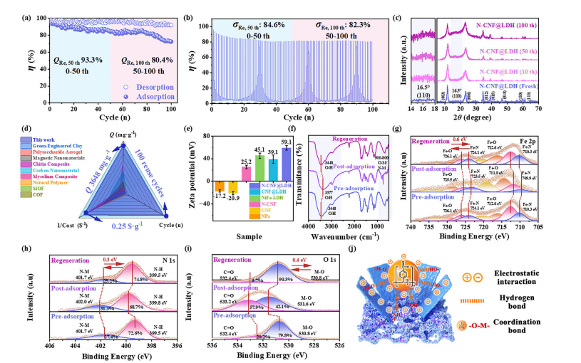 N- CNF @LDH气凝胶的循环稳定性、结构表征及纳米颗粒去除机制。(a) N- CNF @LDH对纳米颗粒的100次吸附-脱附循环性能(初始Q值为3648 mg⋅g−1)及(b)该周期内的应力-应变曲线(σ 表示应力,最大应力为130 kPa)。(c)再生N- CNF @LDH的 XRD 图谱。(d)对比N- CNF @LDH与已报道吸附剂综合性能(吸附容量、循环稳定性和经济成本)的雷达图。(e)NiFe-LDH、 CNF 、N- CNF 及N- CNF @LDH复合材料的Zeta电位比较。(f)N- CNF @LDH吸附纳米颗粒前后的 FTIR 谱。(g-i)高分辨率 XPS 谱:(g)O 1s、(h)N 1s及(i)Fe 2p精细谱。(j)N- CNF @LDH协同去除纳米颗粒的机制示意图。