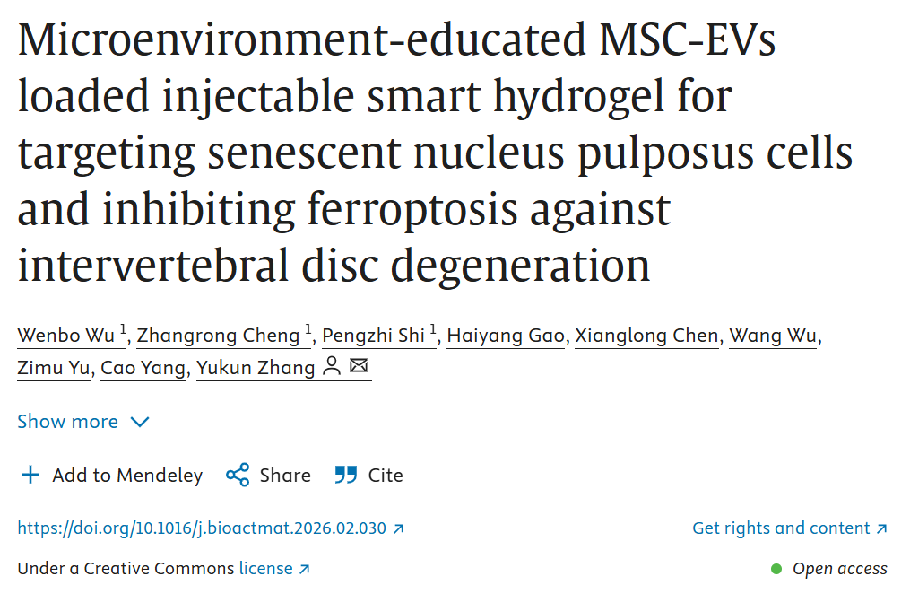 类似的研究思路主要围绕“工程化外泌体+智能生物材料”构建椎间盘退变的修复策略,可分为几个方向: