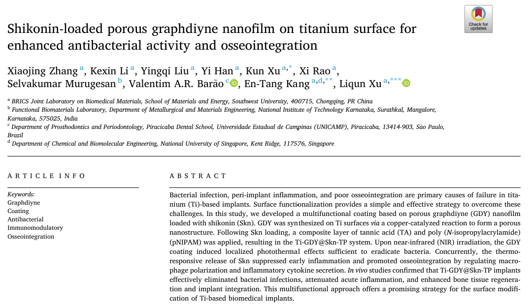 该研究以题为“Shikonin-loaded porous graphdiyne nanofilm on titanium surface for enhanced antibacterial activity and osseointegration”发表在Bioactive Materials上。